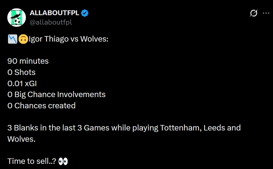 With better-form, better-fixture alternatives like Woltemade, Bowen, and Ekitiké all thriving, holding Thiago is an opportunity cost you don’t need to pay. When the numbers disappear, sentiment shouldn’t keep you anchored. Sell, move on, and don’t look back.