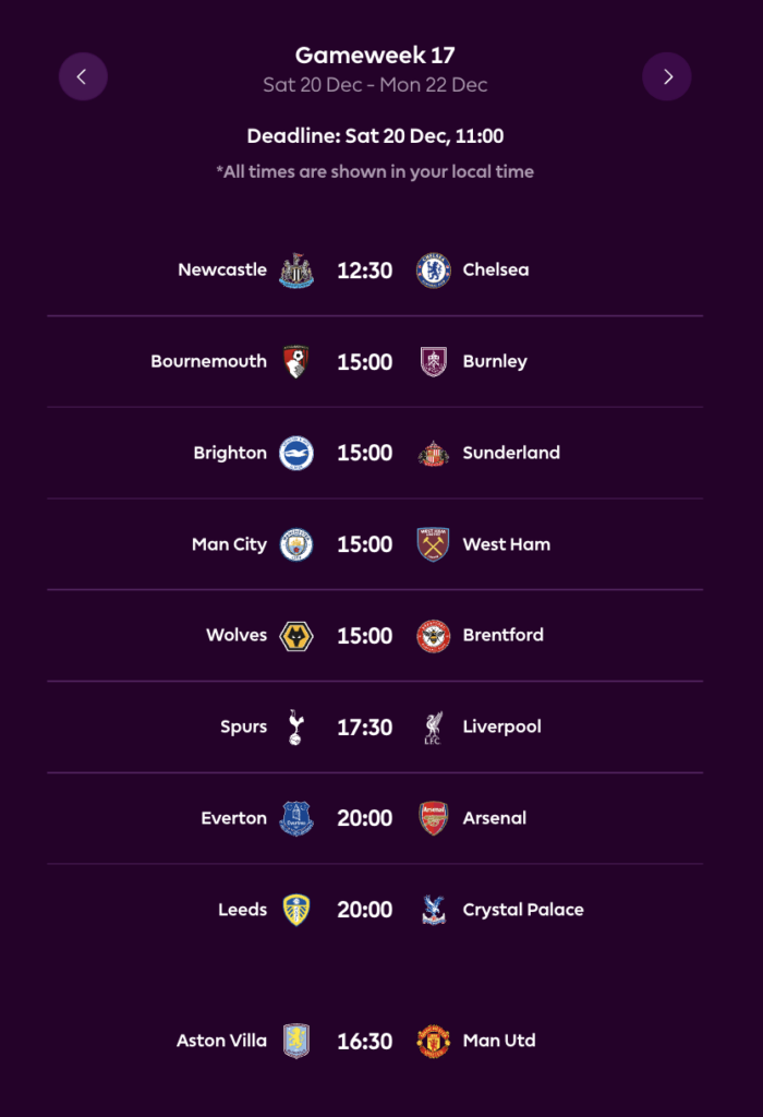 FPL GW17 Fixtures