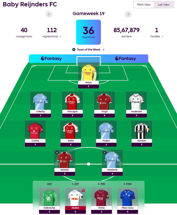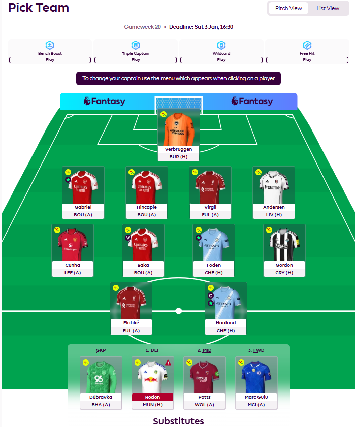 Carrying 2 FT and 0.2 in the bank, I made my moves on Friday evening. I got rid of David Raya and Nico O’Reilly, who was subbed off before the 60-minute mark, for Bart Verbruggen and Gabriel for free. The initial plan was to replace Hincapie for Gabriel, however it seems like Calafiori is still out of the game against Bournemouth and I am hoping Hincapie keeps his place on the Left side of the defence for one more Gameweek.