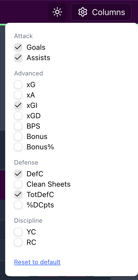 The columns are fully customizable, so you can choose from a range of other stats, including xA, xG, %DC points, bonus, bonus %, BPS, clean sheets, yellow cards, red cards, and more.