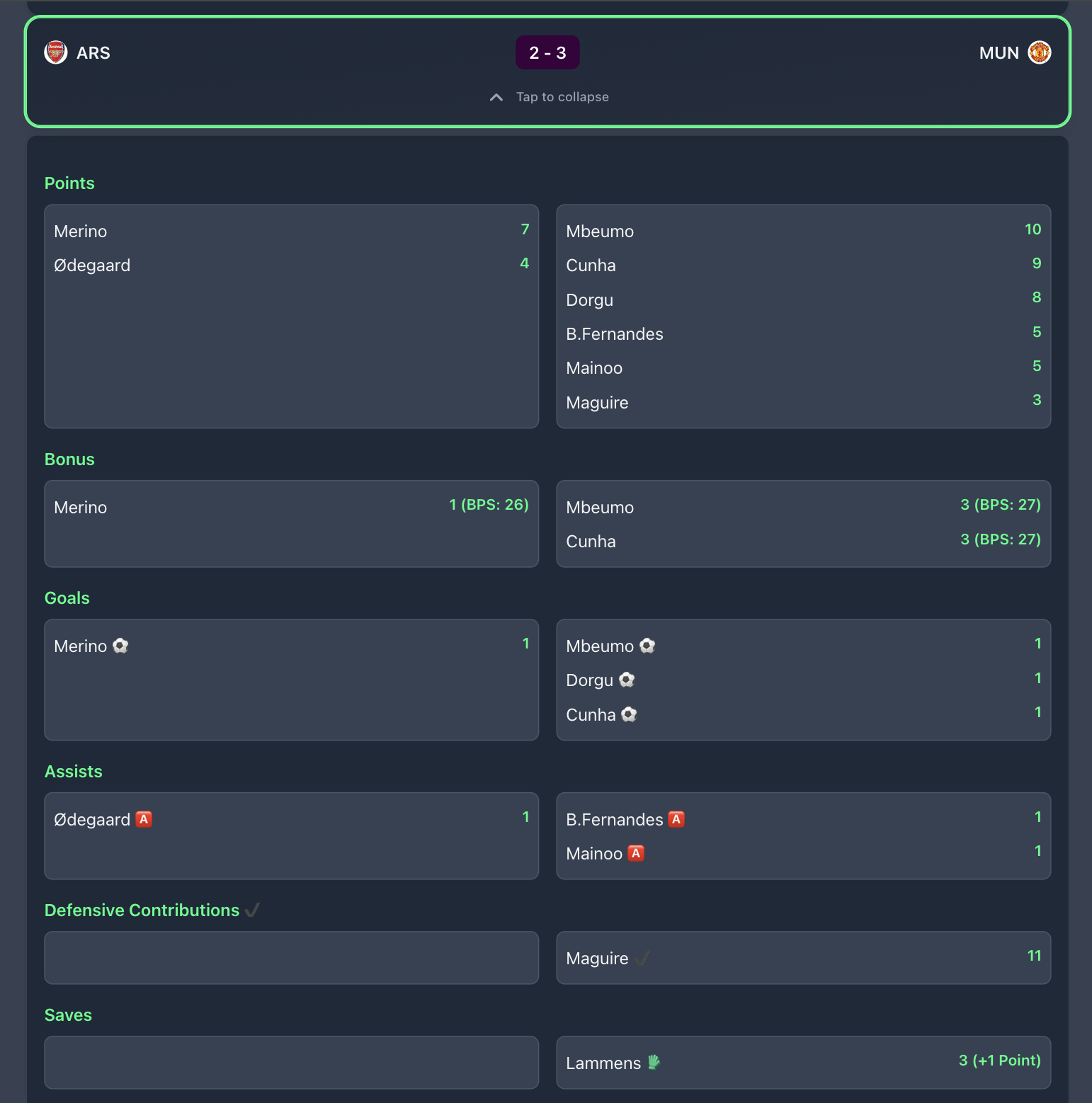 Clicking on each fixture, you can see detailed stats about match score, goal scorers, assists, FPL points, players who hit DEFCON, Saves, Bonus points, BPS, etc., in real time.