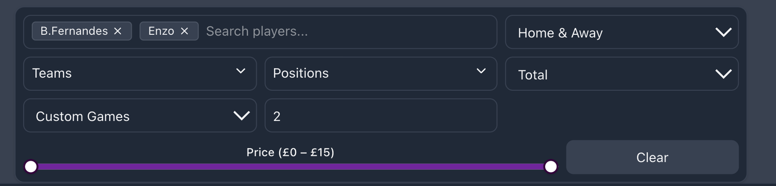 The filters allow you to customize extensively; you can choose teams, positions, home & away, total/per 90, and price range. You can also search for as many players in the search bar to compare stats between them. The data can be all-season data, which is all the data from the season, or you can choose a custom gameweek range, or even choose custom games and add the last X number of games you want to check data for.