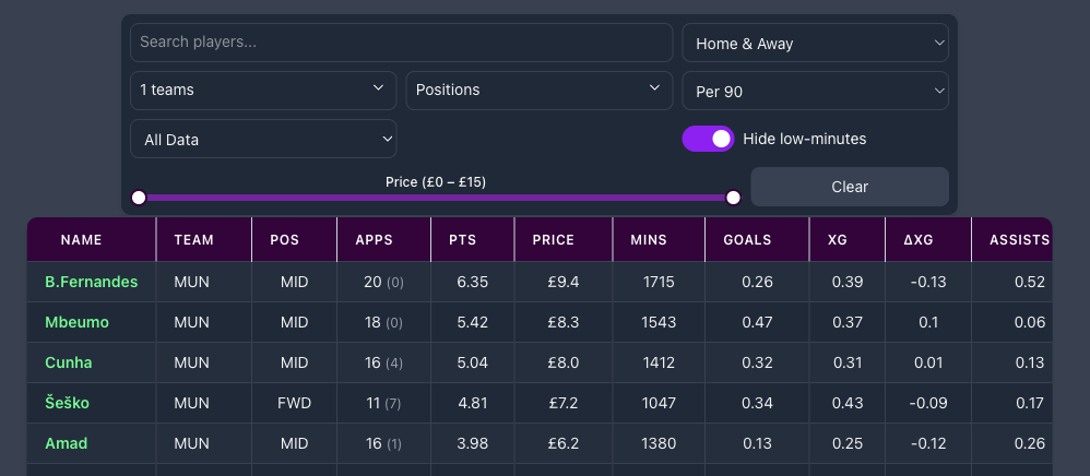 In the example below, we are looking at the per-90 expected stats for Man United players this season. The hide low minutes toggle comes in handy, especially when looking at per 90 numbers.