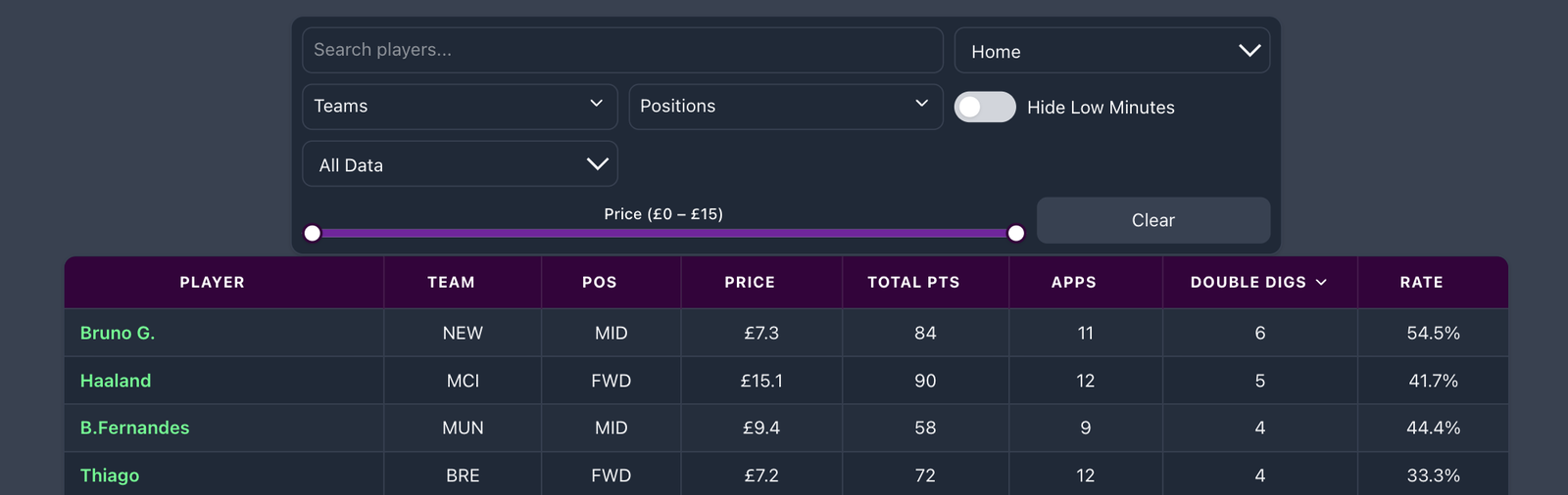 In the example below, you’ll find the double-digit hauls in home games only. Bruno G has the most double-digit hauls in home games only this season.