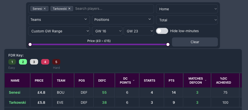The filter bar is consistent across all pages, so just like the stats page, you can also filter by teams, position, check data for specific gameweek period, or the last X number of games. In the below example, we have DEFCON stats for Senesi & Tarkowski from home games between GW16-23.