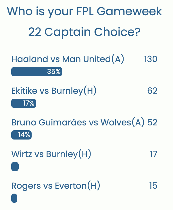 Erling Haaland, tops the captaincy poll for Gameweek 22 with 35% of the votes at the time of writing. Ekitike, who came on as a substitute and scored a goal after also provided an assist, against Barnsley in the FA Cup, finds himself in the second spot with 17% vote share. Bruno G who keeps overperforming his underlying stats, finds himself in the third spot with 14% of vote share.