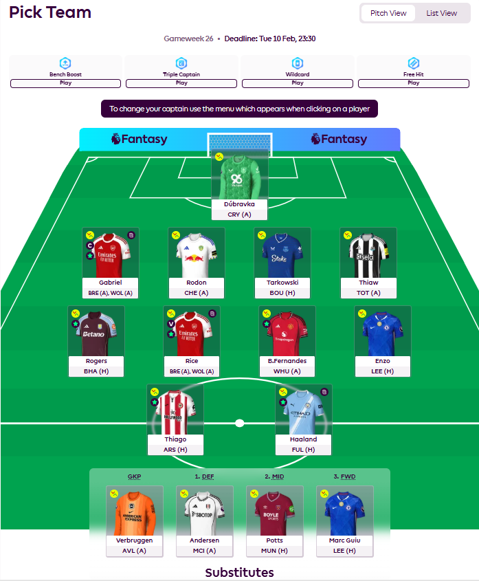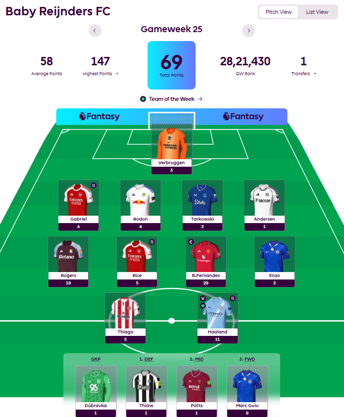 Bruno captain worked out well, although Haaland was a point better off, but we really do not need to fuss about a point on captaincy. Thiago scored but could not manage any bonus points, Rogers came through nicely out of the game against Bournemouth with a 10 pointer (goal and 3 bonus points) and Gabriel and Rice managed clean sheet points and DC returns respectively.