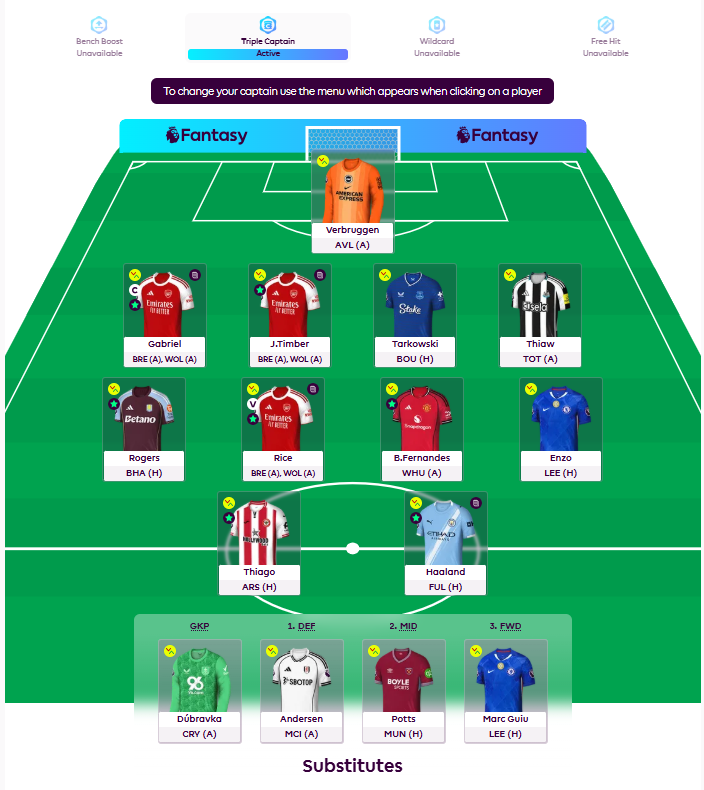 The team is set and the Chip is active! Triple captain chip on Gabriel. Rodon to Timber being the move this week. Good luck all!