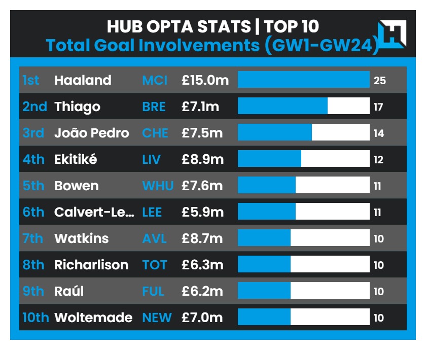 With 10 G+A this season with 14 games to go, Enzo is the second behind only Joao Pedro for most goal contributions this season with Chelsea and the first FPL GW25 Transfer Targets player on the list. He has averaged 2.10 shots, 0.41xG, 1.69 Key Passes, 0.5 Big Chances, 5.21 points and 0.37 Big Chances Created per 90 this season.
