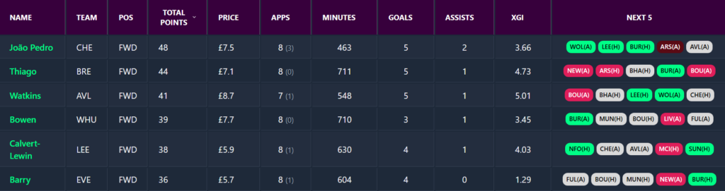 Two double-digits hauls in a row has put Joao Pedro in the limelight once again. The highly owned forward has recorded 5 goal contributions in his last 3 games, where he has averaged 2.21 shots, received 1.32 big chances, 0.6 xGi, 0.88 key passes per 90.