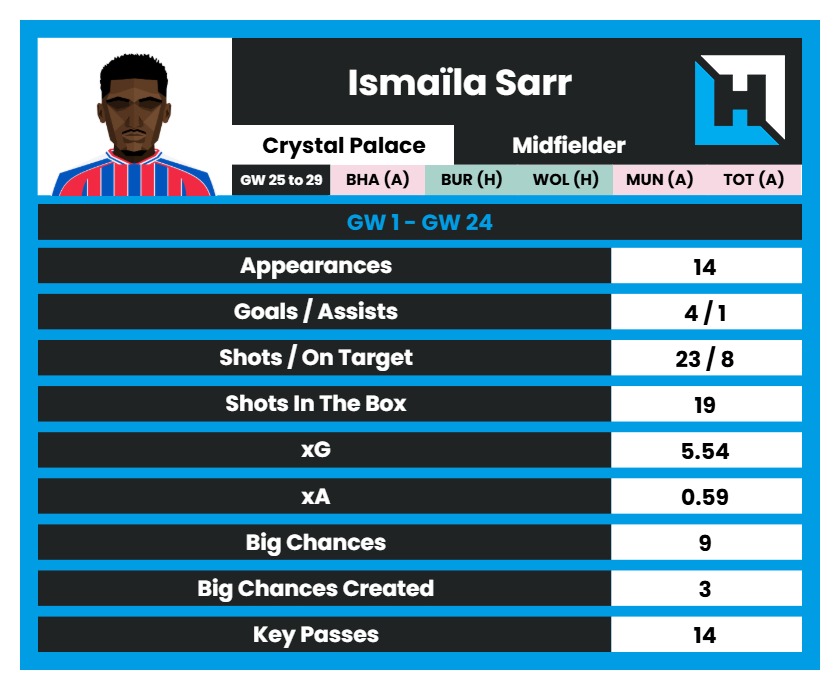 Despite playing just 14 games this season, Ismaila Sarr has already recorded 5 goal contributions. While Mateta staying reduces his penalty appeal, Sarr poses credible threat that should not be overlooked in the upcoming Gameweeks.