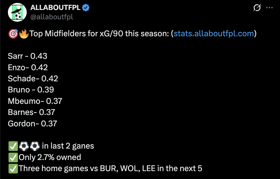 In the last 6 GWs, Wirtz has 4 goal contributions, and in the last 4 GWs, he has 3. The German has been in fine form since Christmas, creating 11 chances for his teammates across the month of January. He has 4 double-digit hauls in the last 7 GWs, and, having blanked against City, that surely means he’ll haul in GW26 (because that’s how probabilities work)… Sunderland are a decent side, but their massive xGA overperformance is slowly starting to catch up with them – I’m seeing shades of Nottingham Forest last season all over again! Wirtz is a great pick in FPL due to his great form, decent underlying stats, and fantastic fixtures over the next few GWs.