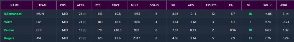 We have selected a midfield four of Wirtz (8.4m), Palmer (10.6m), Rogers (7.6m) and Bruno F (9.8m) for FPL GW27…