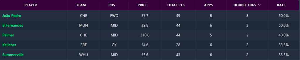 Most Double Digit Hauls in the last 6 Gameweeks:
