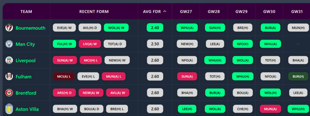Bournemouth has the best FDR in the next five Gameweeks with just a 2.40 rating, where they play West Ham (A), Sunderland (H), Brentford (H), Burnley (A) and Manchester United (H), a run where Hill can continue his impressive streak of point scoring.