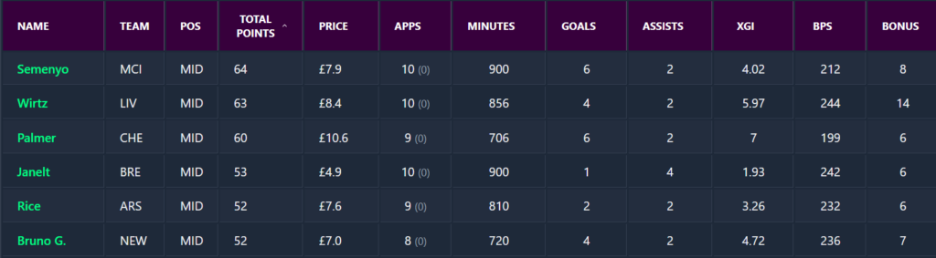 Top Midfielders for FPL Points over the last 10 Gameweeks: