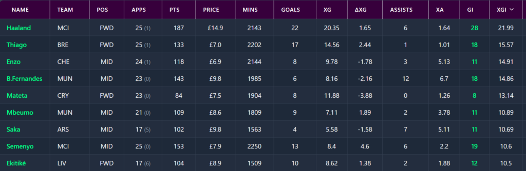 Among Forwards, Thiago is ranked only behind Haaland for all the attack metrics this season- Shots inside the box, Big Chances, xG, Goal Involvements, xGI and FPL Points.
