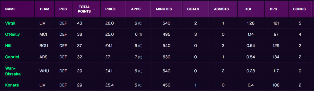 Top Defenders for FPL Points over the last 6 Gameweeks:
