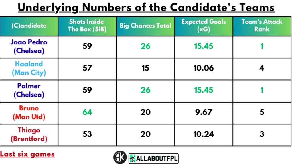 Palmer tops the table with 11 shots in the box, 7 Big chances, and an xG of 5.15 in the last six games.