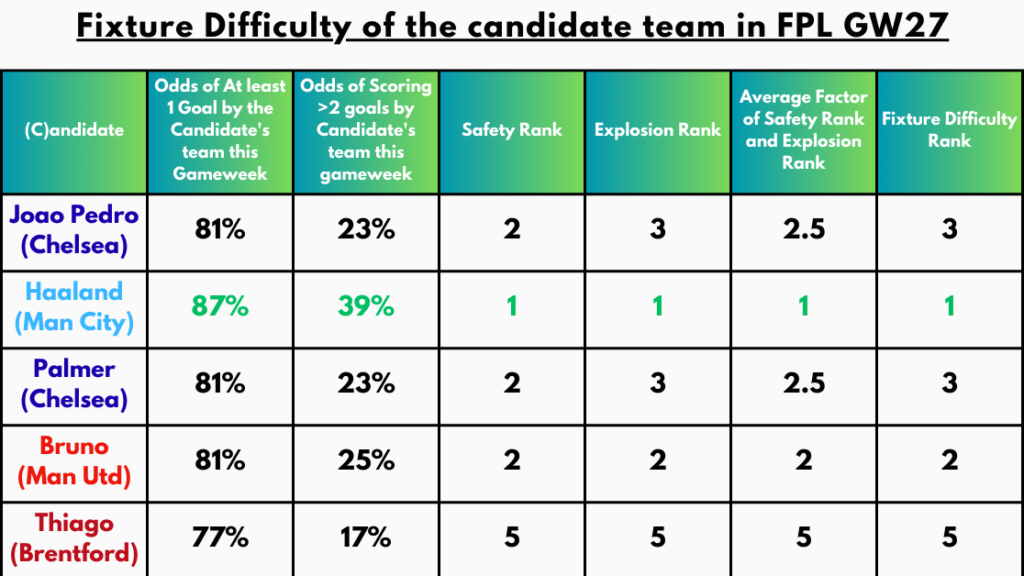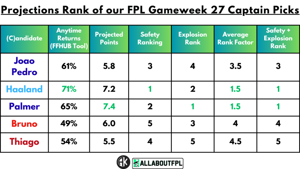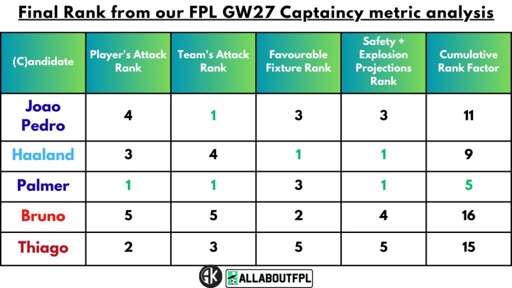 Conclusion – Final Rank from our FPL Gameweek 27 Captaincy metrics