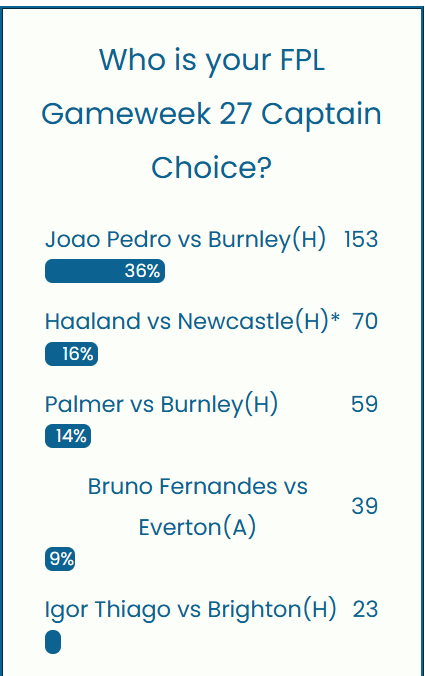 Joao Pedro tops the captaincy poll this week with 36% of the votes and will be up against Burnley (H). Haaland, who seems to have been cleared for fitness by Pep, is 2nd with 16% of the votes. Palmer is 3rd in the captaincy poll this week with 14% of the votes. Bruno Fernandes is up against Everton away is 4th, while Igor Thiago starts a run of great fixtures against Brighton (H), rounds up the captaincy picks for GW27.