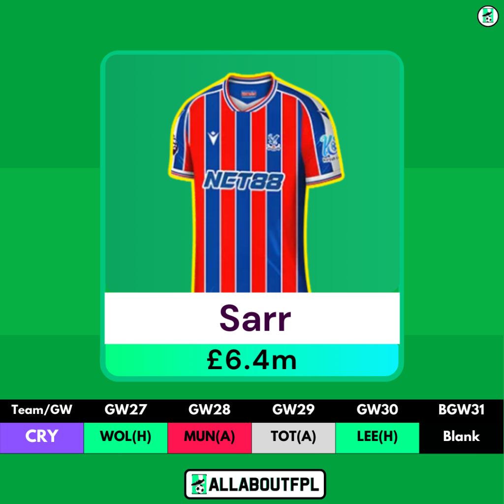 - Sarr has always been an explosive mid-priced midfielder in FPL. What makes him more attractive now is his added responsibility of penalties, until Mateta is back from injury.
