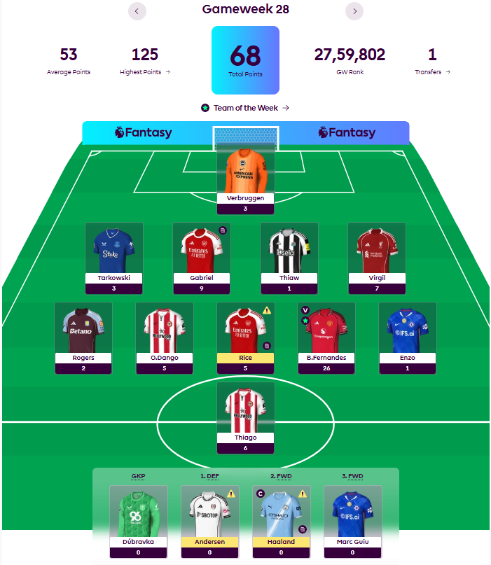 Gameweek 28 was a bit of an average week for me. I would say it is a bit disappointing as there were a few missed opportunities too. I managed to score 68 points, which was also the Safety score for me. Resultantly, I went from 663k to 652k, I would count it as a grey arrow really. The move I did turned out to be a bit sideways, as Van Dijk scored a goal, who I transferred in, as did Timber who I transferred out.