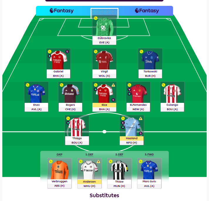 There could be a ton of issues in this team, or none. It all depends on the fitness news on Rice and Haaland really. And so do my transfer plans. If we get news that both Haaland and Rice are out, I am really set on getting Liverpool duo Ekitike and Salah for a hit. It’s for sure risky, but it has a lot of upside and Salah is a massive differential. But of a nostalgia pick now maybe, but he is FPL Gold, and when the going gets tough, you just invest in Gold..