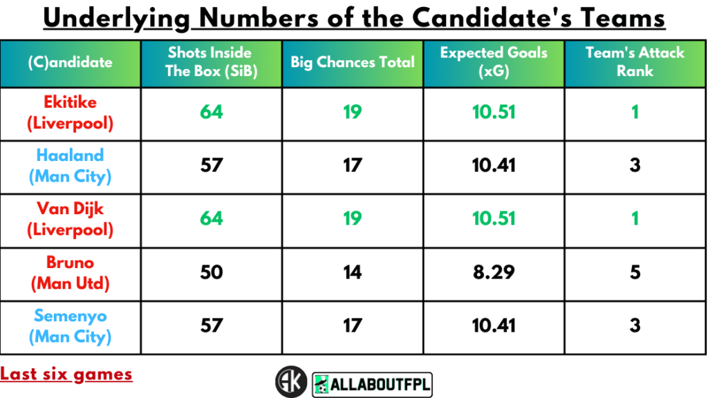 Ekitike tops the table with 15 shots in the box, 8 Big chances, and an xG of 3.09 in the last six games.