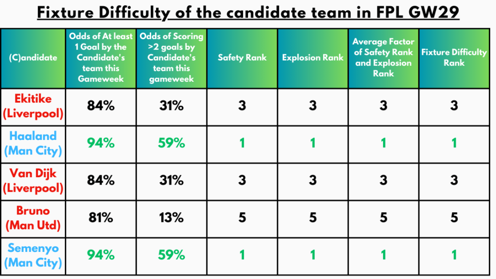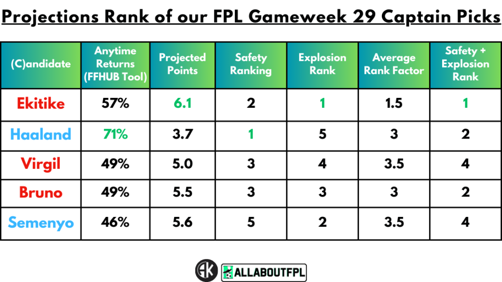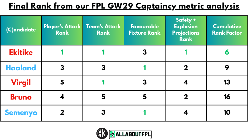 Conclusion – Final Rank from our FPL Gameweek 29 Captaincy metrics