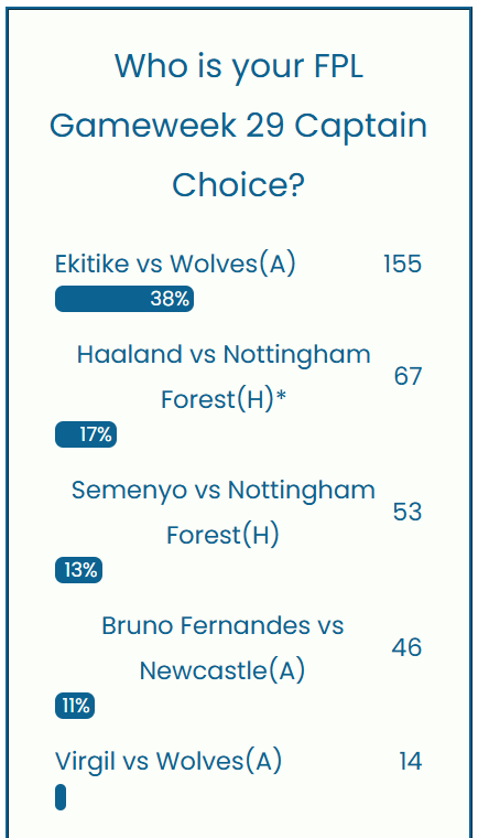 Ekitike tops the captaincy poll this week with 38% of the votes against Wolves (A). Haaland is 2nd with 17% of the votes. Semenyo is 3rd in the captaincy poll this week with 13% of the votes. Bruno Fernandes, who is up against Newcastle, is 4th, while Virgil Van Dijk rounds up the captaincy picks for GW29.